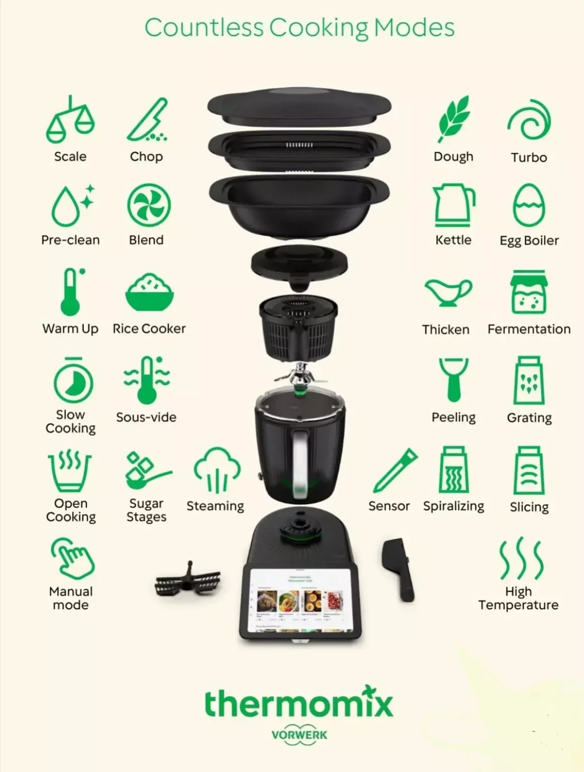 Imagine having one smart appliance that can chop, mix, blend, knead, steam, cook — and even clean itself! The Thermomix TM7 brings over 20 kitchen functions together in one sleek, powerful machine, saving you time while helping you cook fresh, delicious meals from scratch.